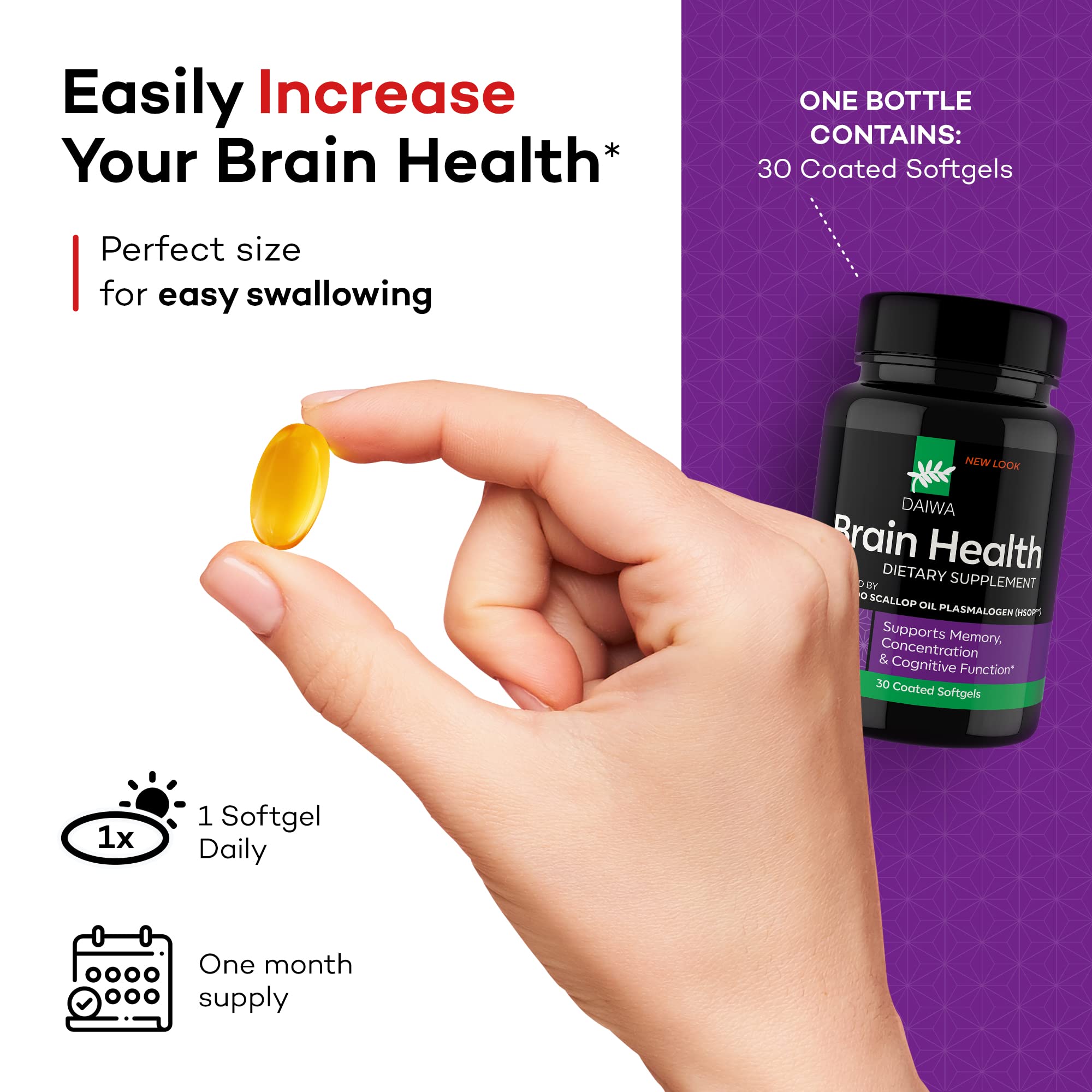 - Huile de plasmalogène pour se sentir plus vif et clair d'esprit — les suppléments mémoire Daiwa Brain Health sont conçus pour contrer le brouillard cérébral souvent lié à l'âge et au stress. Améliorez la mémoire à court terme, la précision d'apprentissage et la concentration avec une gélule molle par jour !