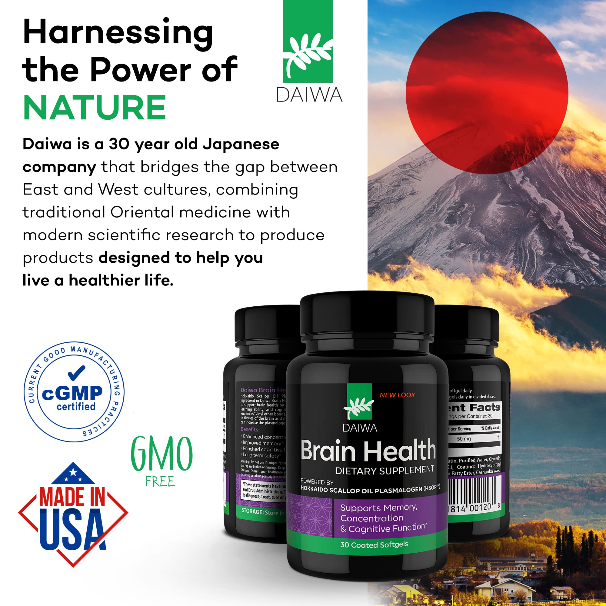 - Le supplément mémoire de Daiwa pour le cerveau contient des peptides de natto, des enzymes DBH et de l'huile de pétoncle de Hokkaido Plasmalogen (HSOP), un antioxydant innovant qui a prouvé son efficacité pour améliorer la mémoire et les fonctions cognitives.