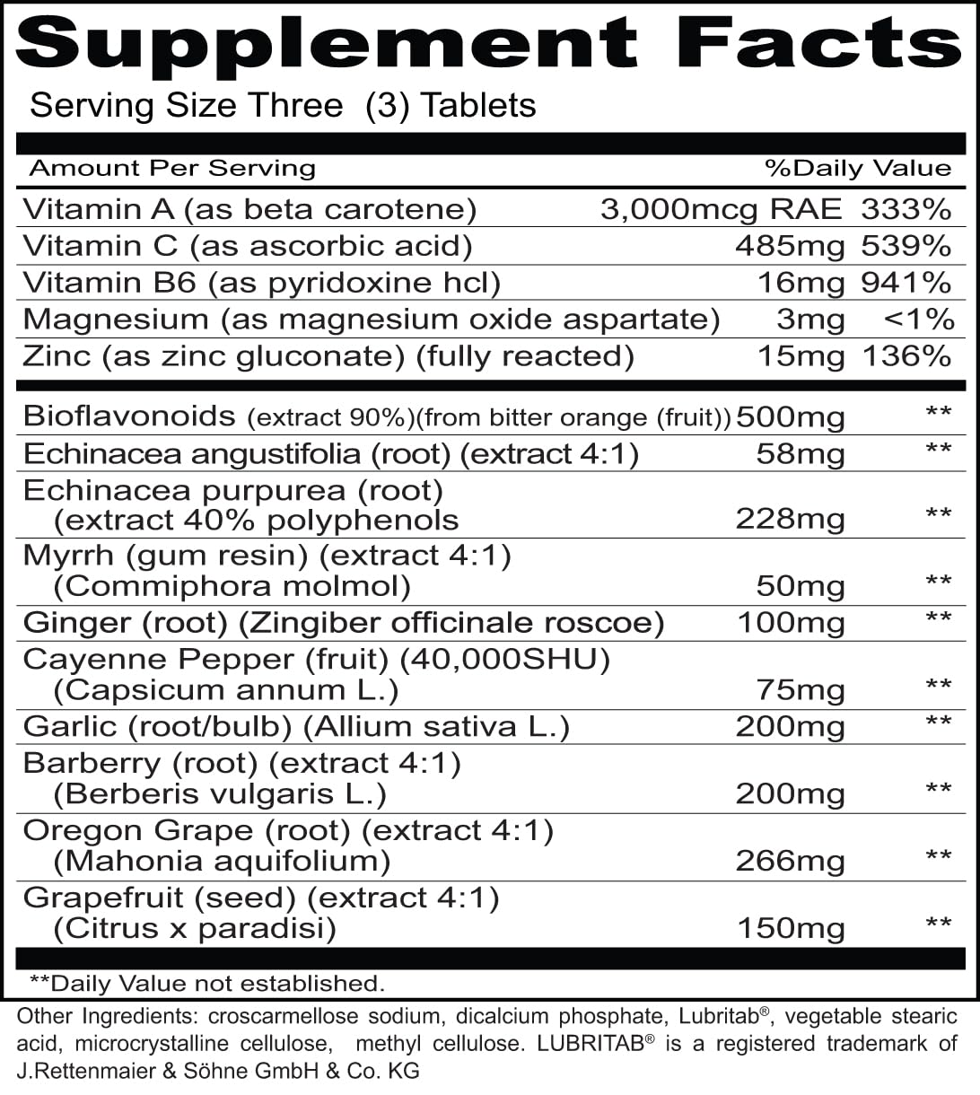Ces comprimés à base de plantes pour le soutien du système immunitaire offrent une combinaison d'essentiels renforçant l'immunité, incluant les vitamines A, C, B6, le zinc, et une puissante gamme d'extraits de plantes. Ces extraits contiennent des alcaloïdes isoquinoléines clés tels que la berbérine présente dans l'épine-vinette et la vigne d'Oregon, avec le soutien immunitaire des amides alkyles liposolubles trouvés dans la racine d'échinacée de haute qualité. Ajoutez à cela des bioflavonoïdes d'agrumes, de la résine de myrrhe, de la racine de gingembre, du cayenne, de l'ail et de l'extrait de pépins de pamplemousse, et vous obtenez un allié à base de plantes pour le soutien du système immunitaire comme nul autre.*