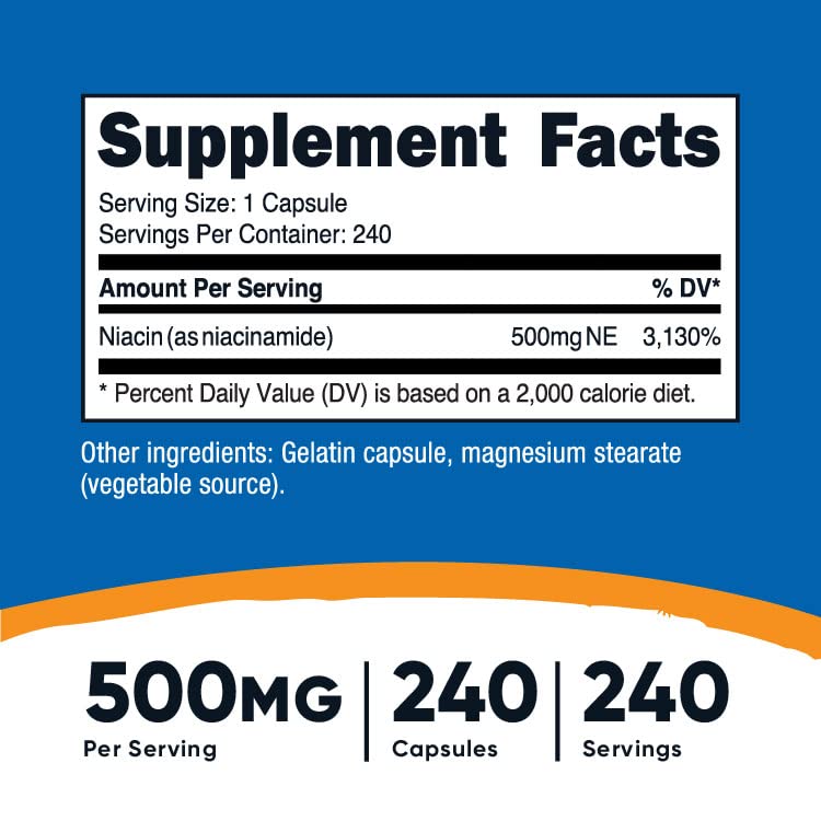 - 500 mg de Vitamine B3 (Niacinamide) par capsule