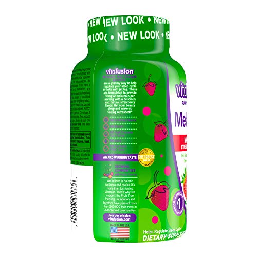 • Une bouteille de 100 comprimés de compléments gélifiés vitafusion Max Strength Melatonin, gommes à la mélatonine pour adultes saveur fraise, compléments pour le sommeil suffisants pour 50 jours
